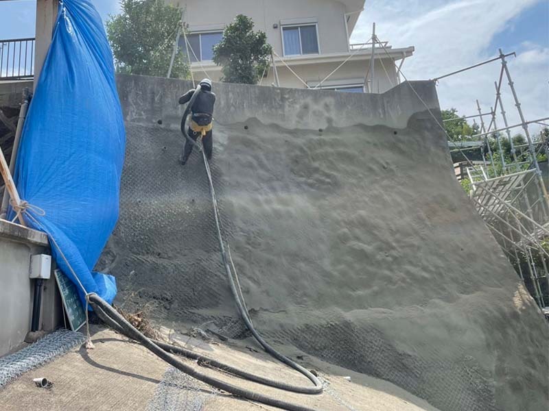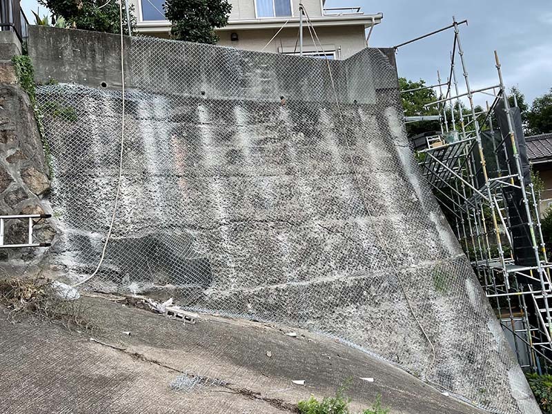 土地形状や雨水の流れを分析し、排水設備も含めた長期視点の設計を採用。企業の稼働を止めずに施工できるようモルタル吹付工事を行いました。